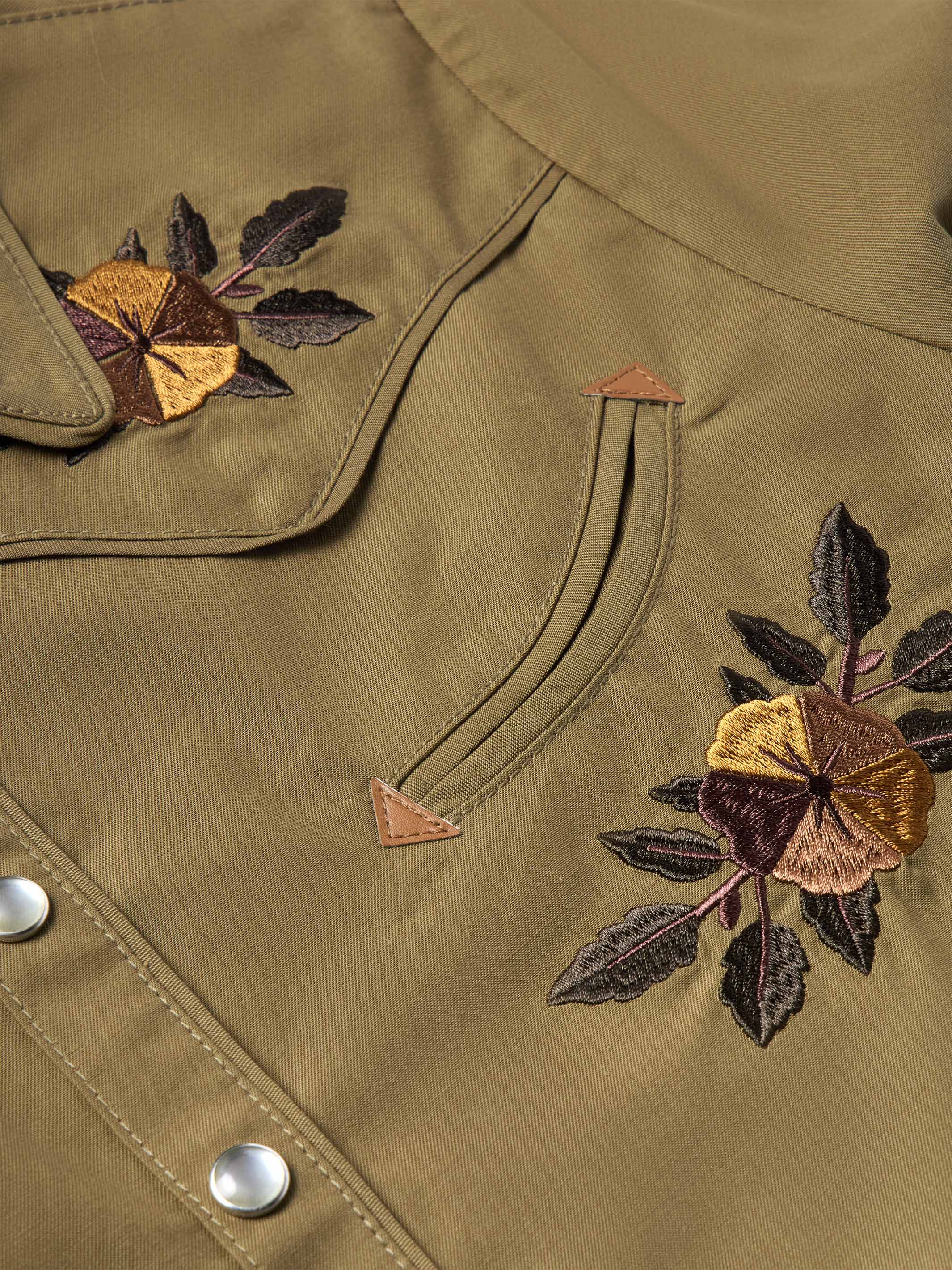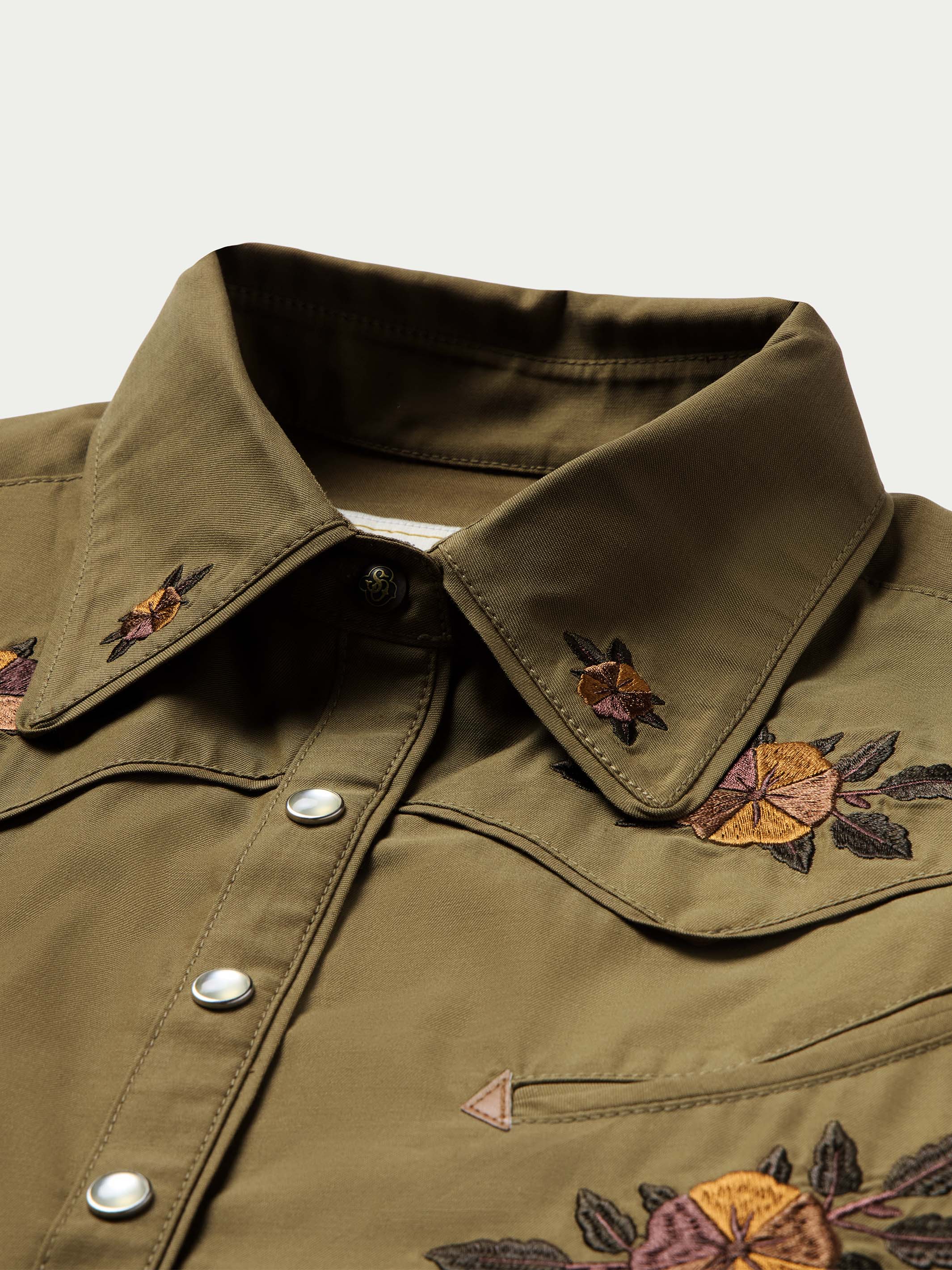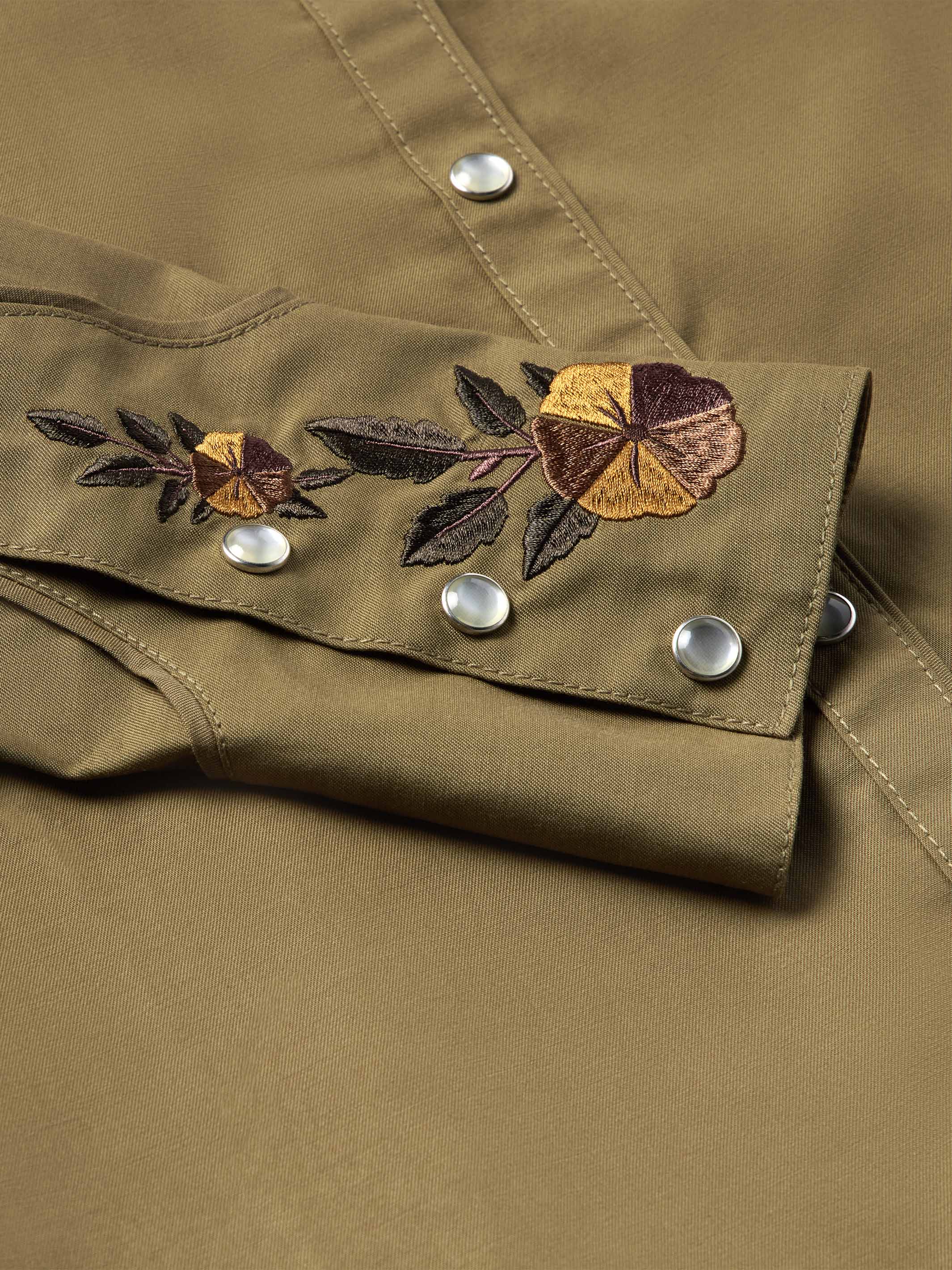 Framed by smile pockets and 1940's style rodeo cuffs, this shirt features floral embroidery inspired by vintage western textiles.