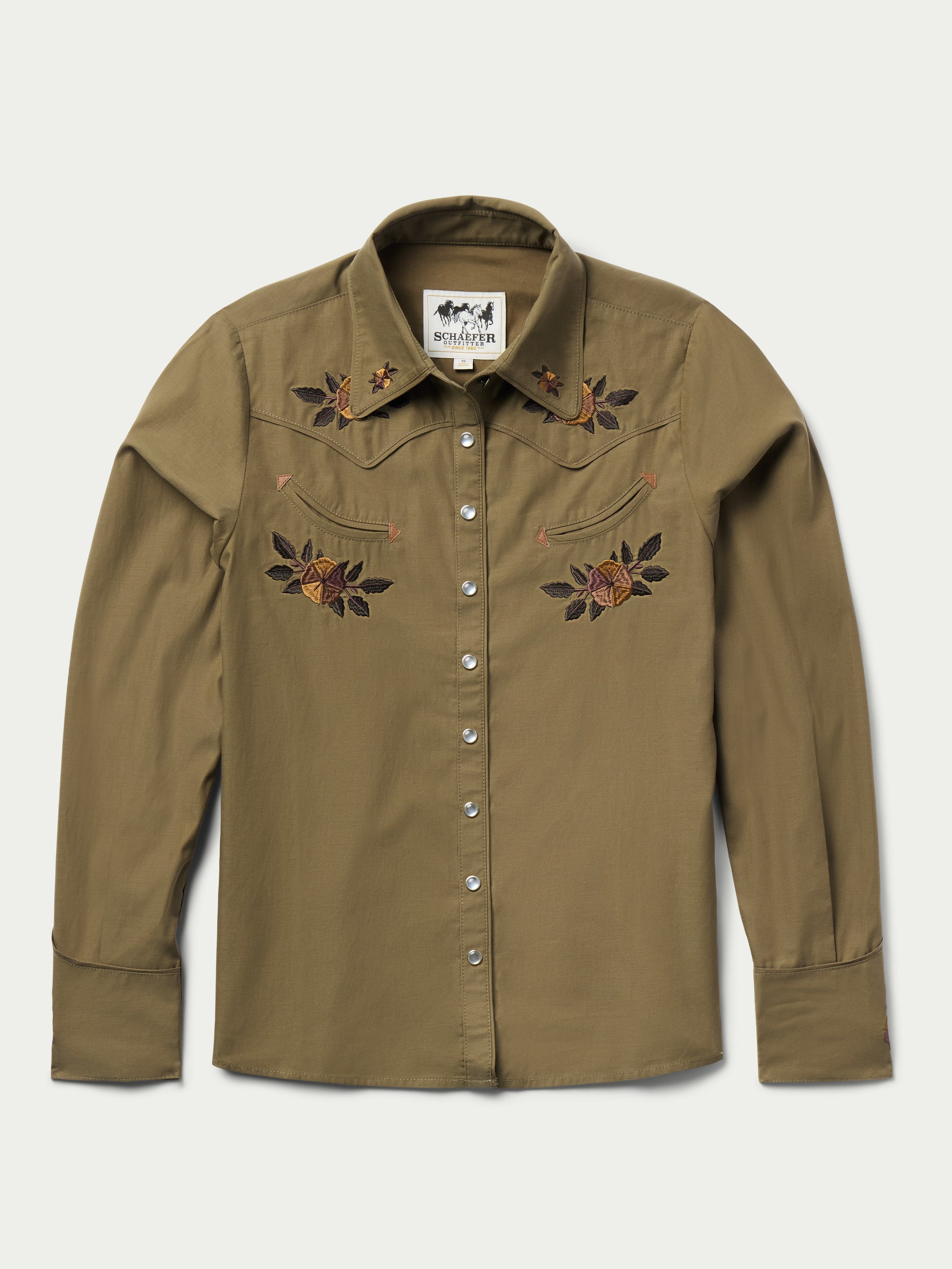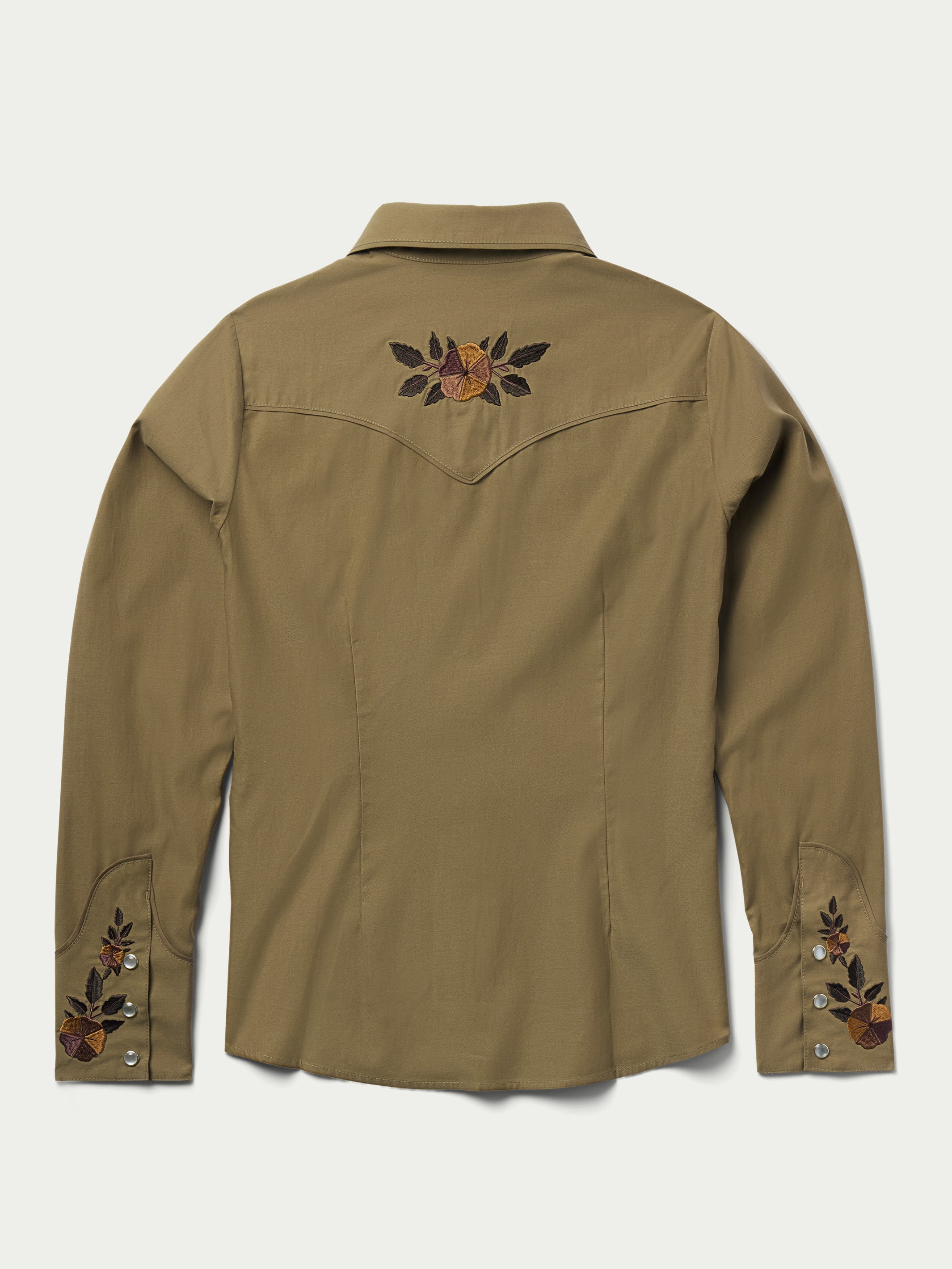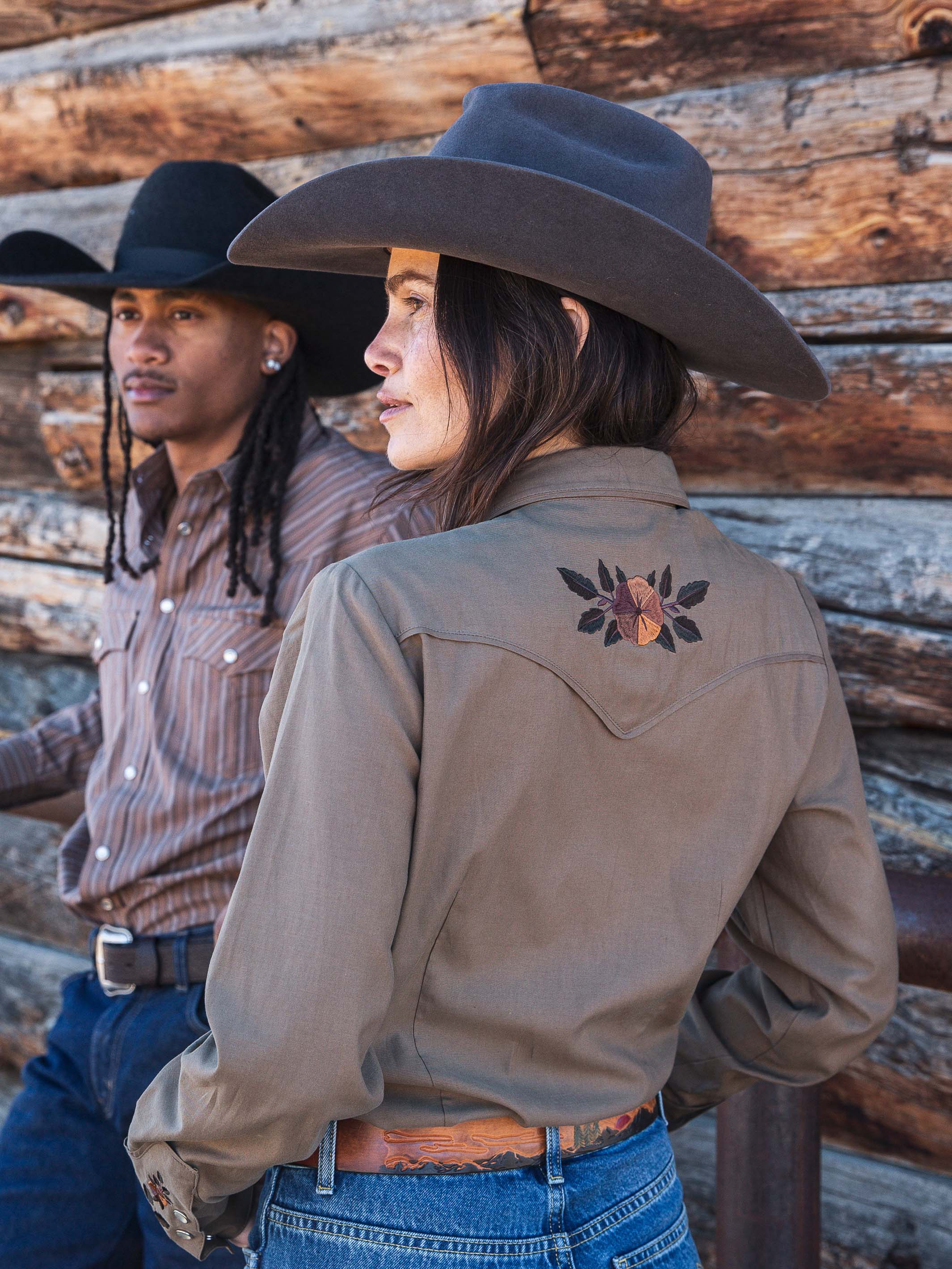 Framed by smile pockets and 1940's style rodeo cuffs, this shirt features floral embroidery inspired by vintage western textiles.