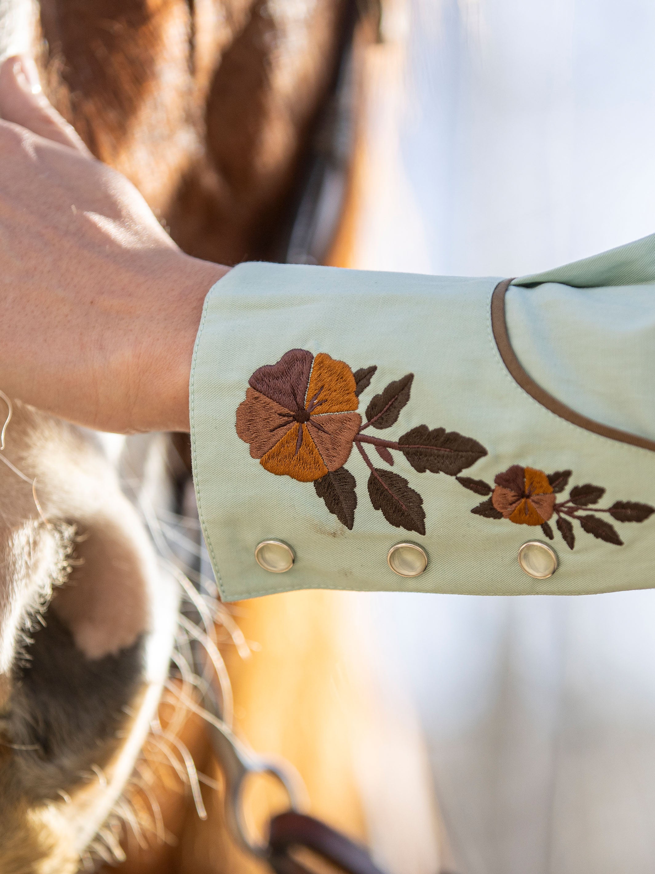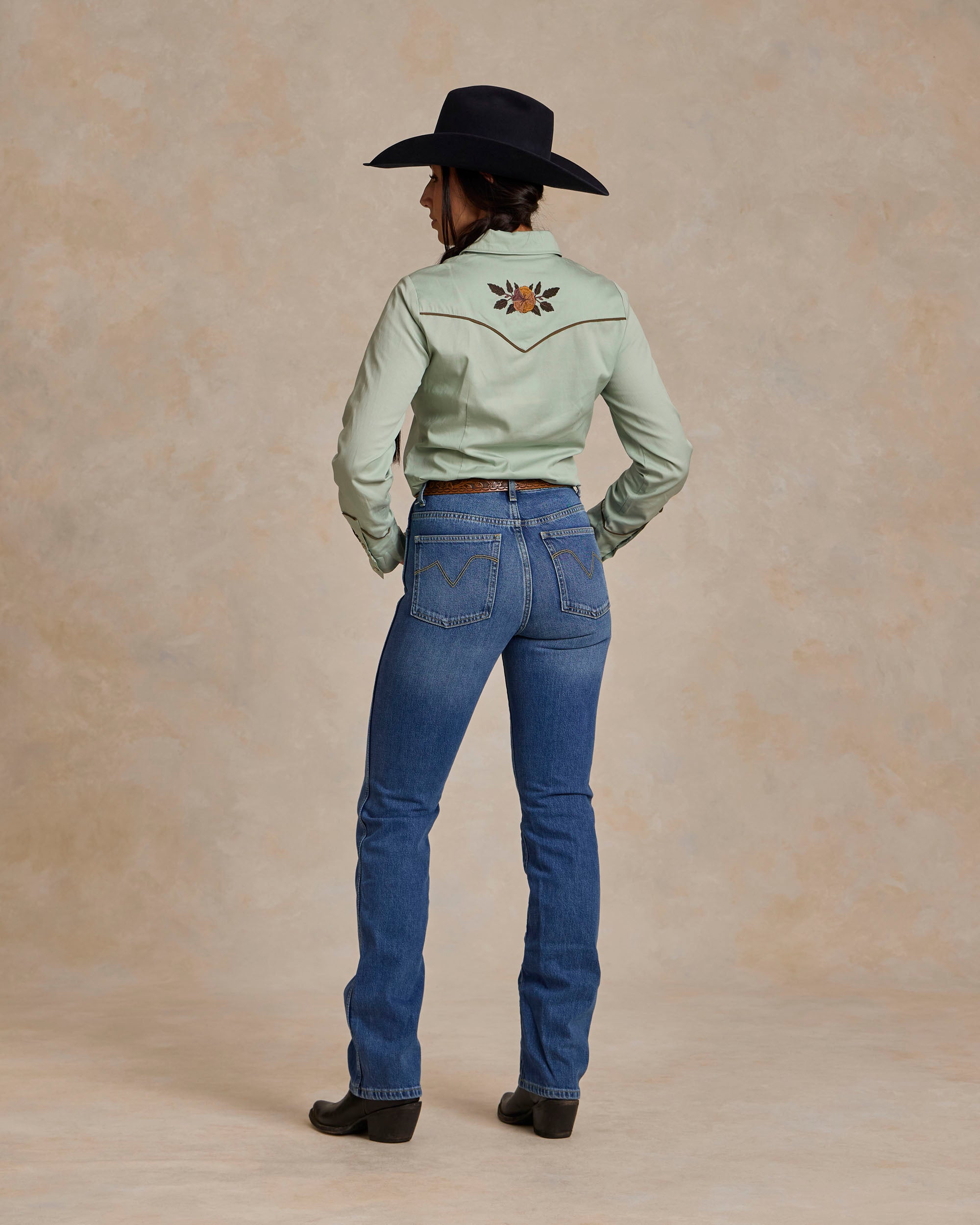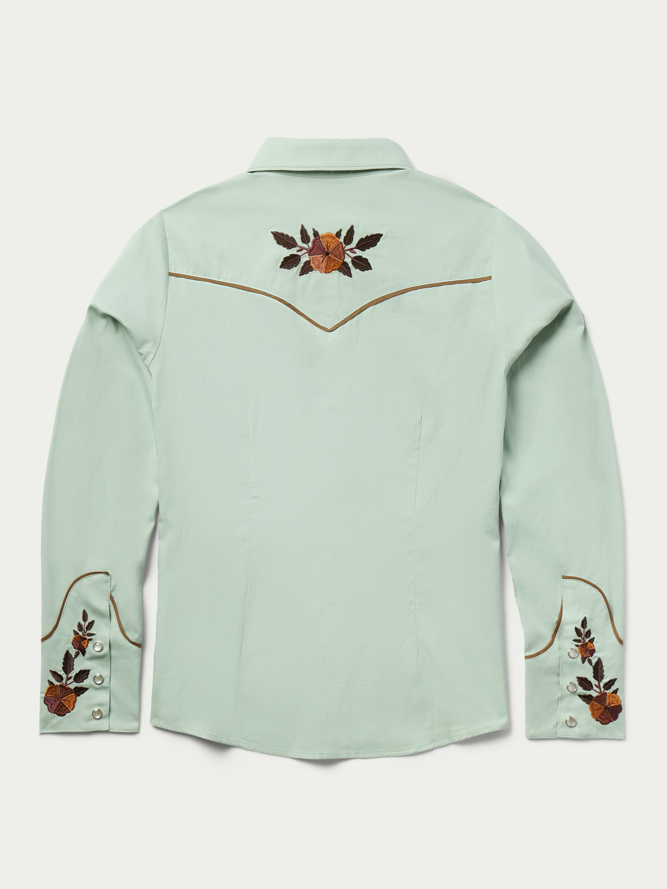 Framed by smile pockets and 1940's style rodeo cuffs, this shirt features floral embroidery inspired by vintage western textiles.